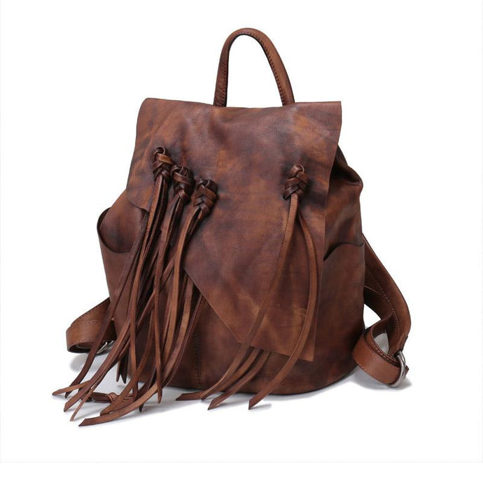 13" Medium Ladies Brown Leather Fringe Backpack Purse Cool Book Bags for Women