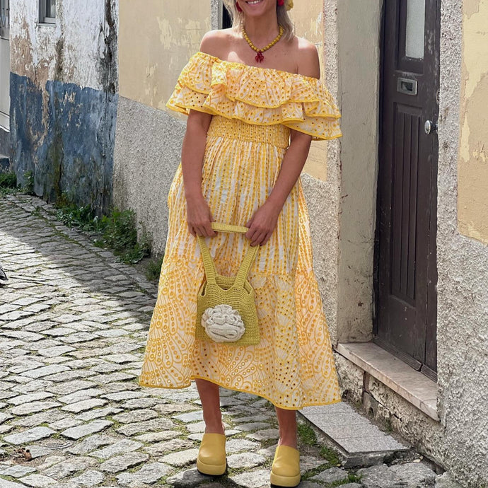 Off Shoulder High Waist Hollow Out Lace Midi Dress
