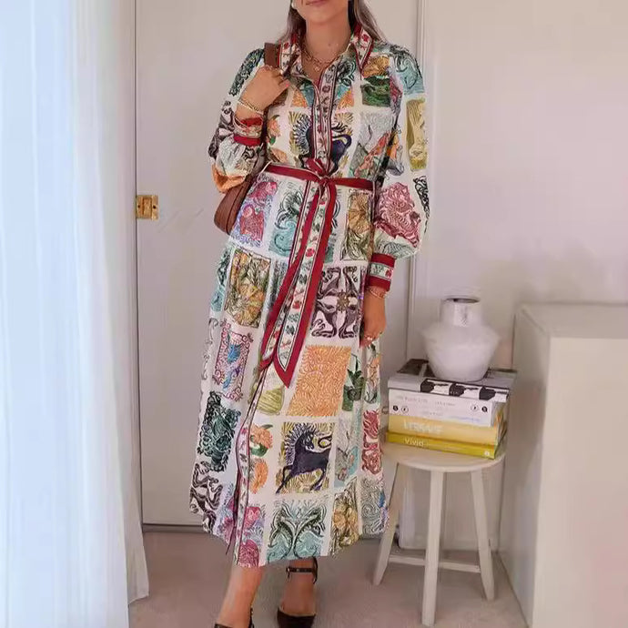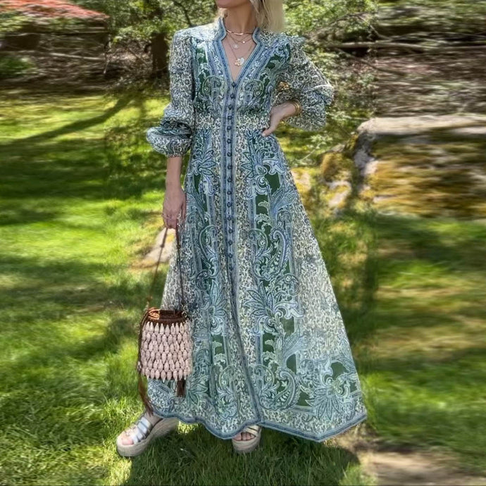 Retro Single-breasted Long-sleeves V-neck Printed Maxi Dress