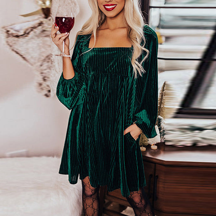 Green Tie Back Square Neck Velvet Babydoll Dress