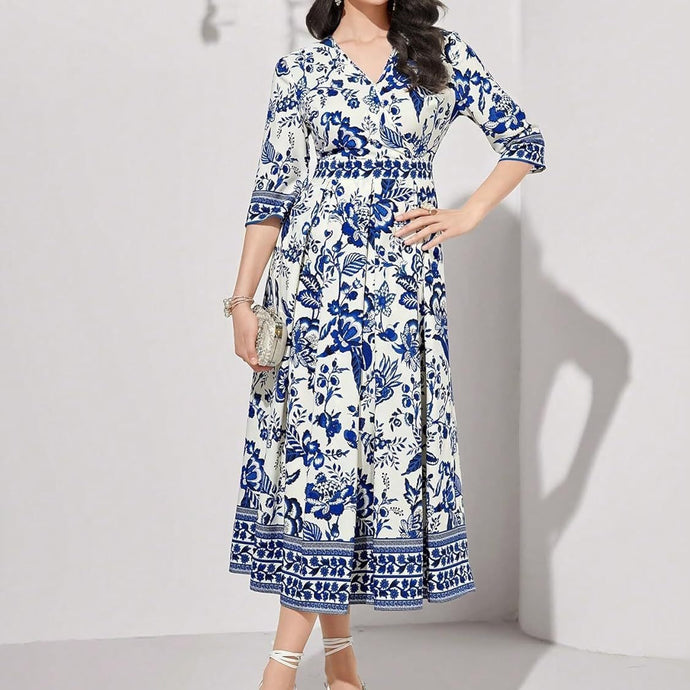 Blue V-neck Half Sleeves Floral Maxi Dress
