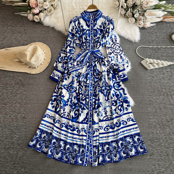 Retro Long Sleeve Buttons Down Print Maxi Dress