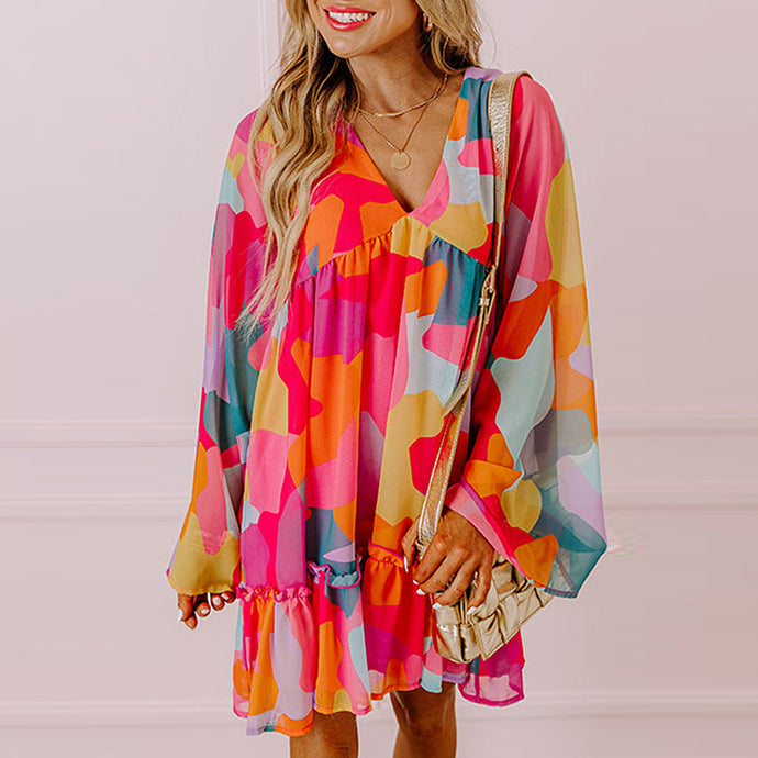 Loose Abstract Print Bell Long Sleeve V Neck Babydoll Dress