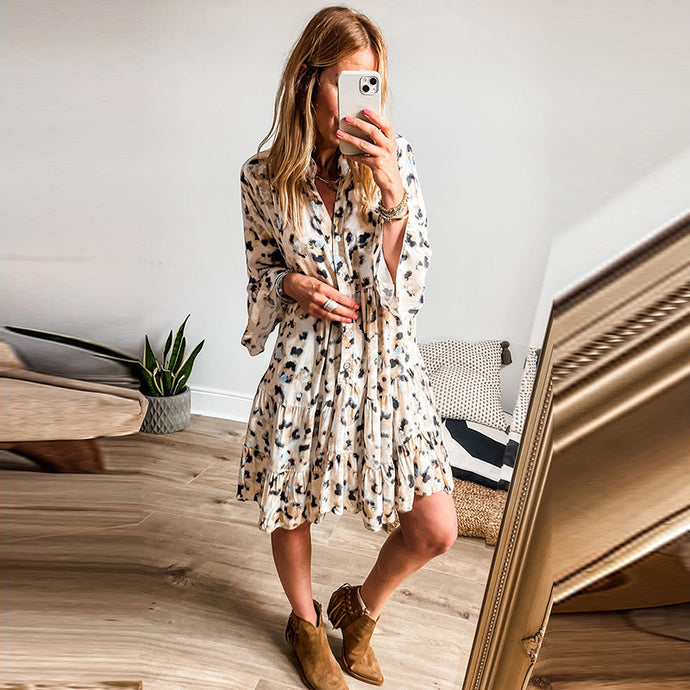 Leopard Print Buttoned Front 3/4 Sleeve Tiered Ruffled Hem Dres