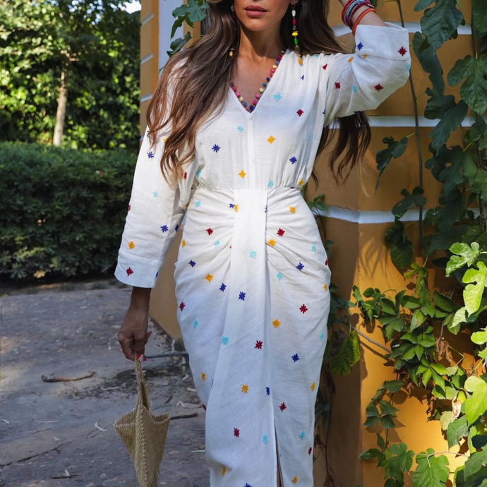 White V-neck Embroidery Long Sleeve Midi Dress