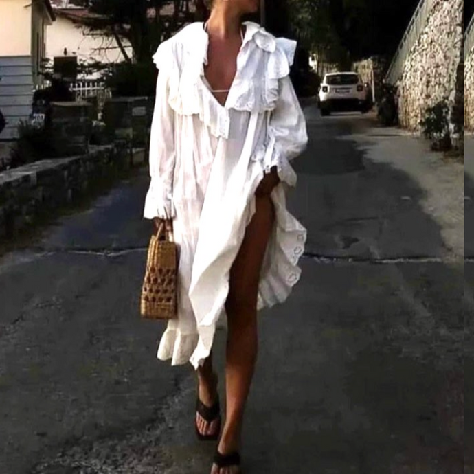 White Long Sleeves Collared Cinched Waist Button Down Midi Dress