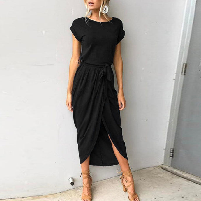 Casual Round Neck Irregular Ruched Slit Front Midi Dress