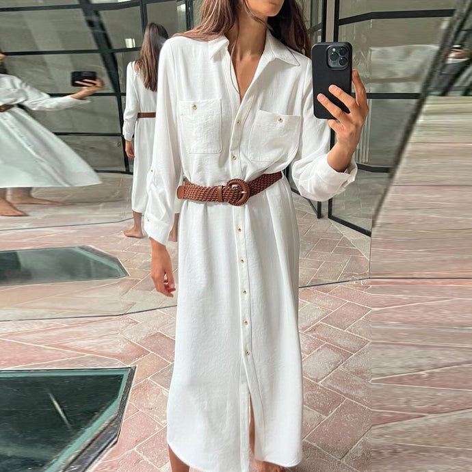 White Pockets Long Sleeve Belted Collared Shirt Midi Dress