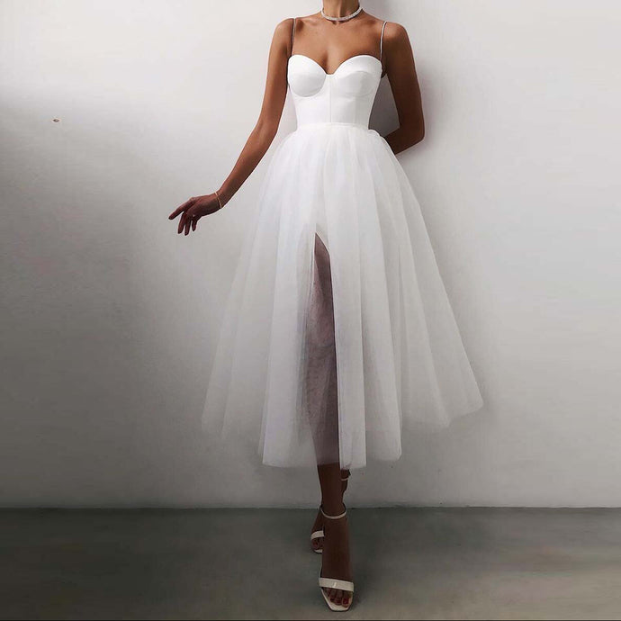 French Vintage Sweatheart Spaghetti Straps Split Side Mesh Midi Dress
