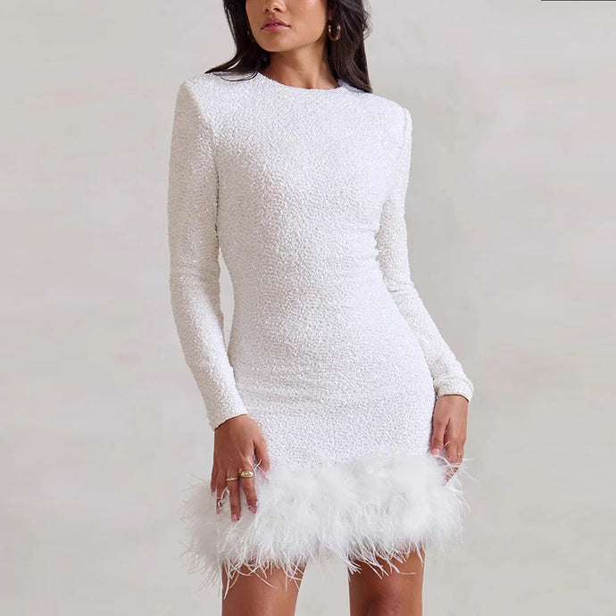 Sexy Party Sequins Feather Round Neck Mini Evening Dress