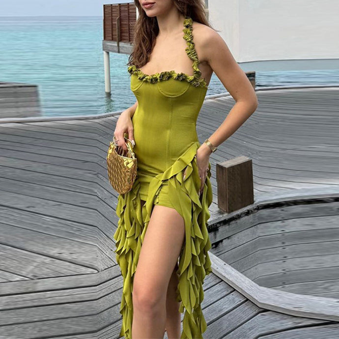 Sexy Backless Ruffle Irregular Hem Halter Midi Dress