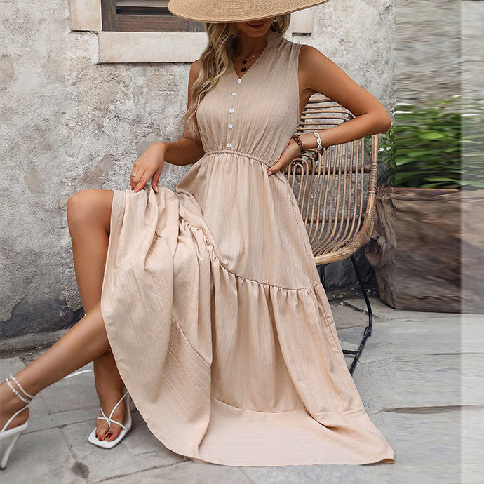Sleeveless High Waisted Buttoned Elasticity Pleated Split-Joint Tiered Midi Dress