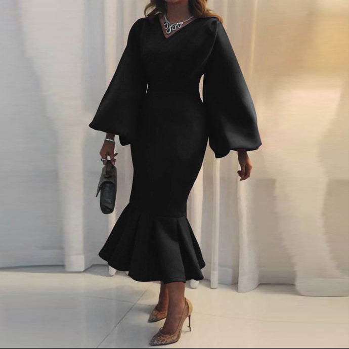 Elegant V Neck Long Sleeves Ruffled Midi Evening Dress
