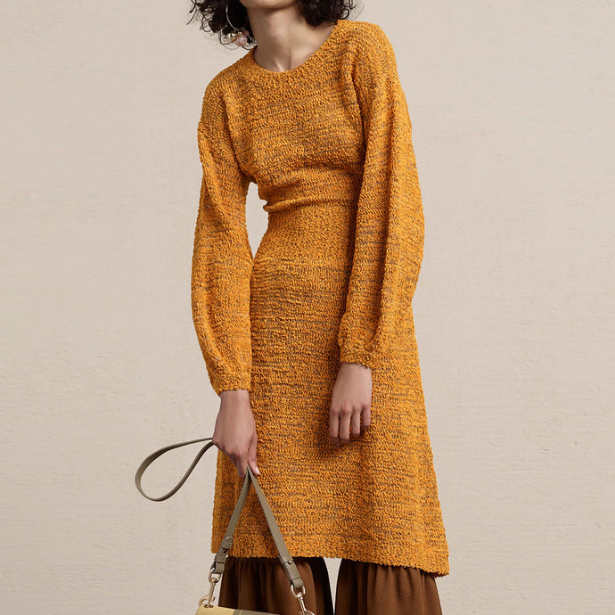 Yellow Long Sleeve Crew Neck Knitted Midi Sweater Dress
