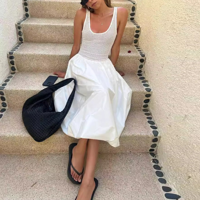 White Casual Patchwork U Neck Sleeveless Midi Dress