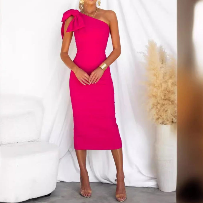 Elegant Bow Detail One Shoulder Bodycon Midi Dress