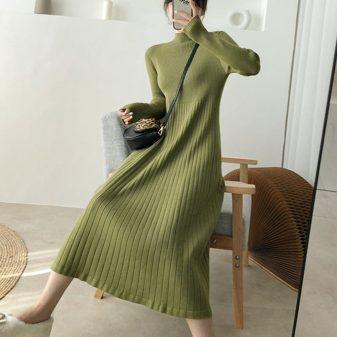 Green Casual Long Sleeve Half Turtleneck Knit Sweater Dress