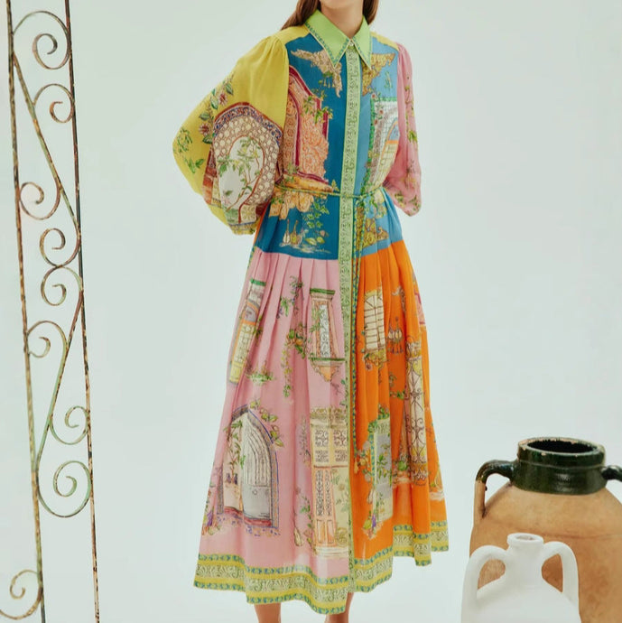 Unique Garden Print Button-Down Long Sleeve Midi Dress
