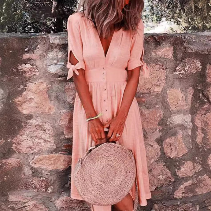 Casual Elegant Buckle Knotted V Neck Buttons Down Midi Dress