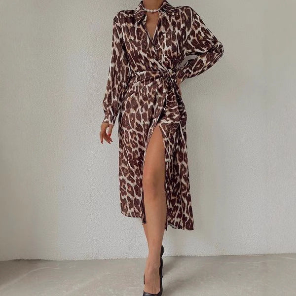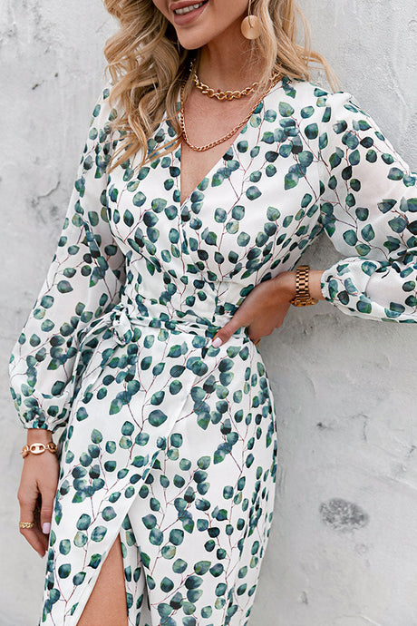 Leopard Print Long Sleeves Ruched Wrap Split Front Midi Dress
