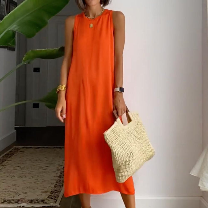Simple Orange Sleeveless Plain Midi Dress