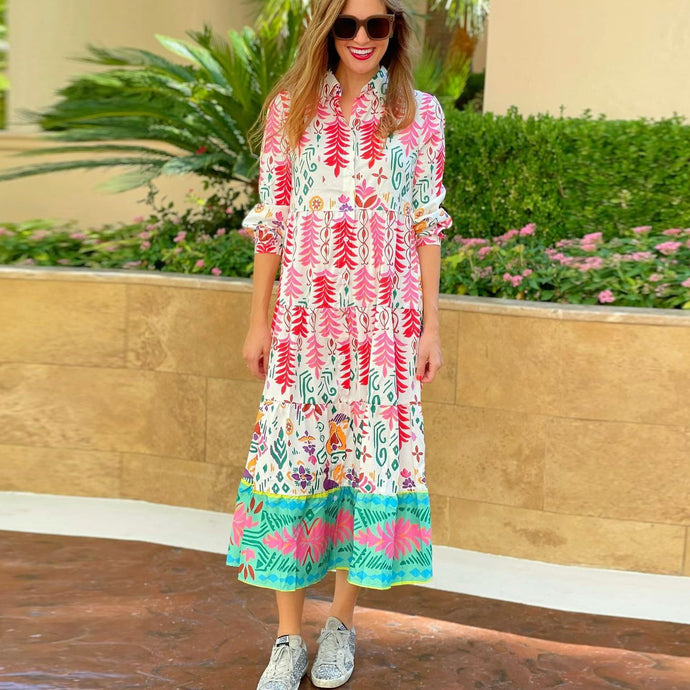 Print Collar Long Sleeve Midi Dress