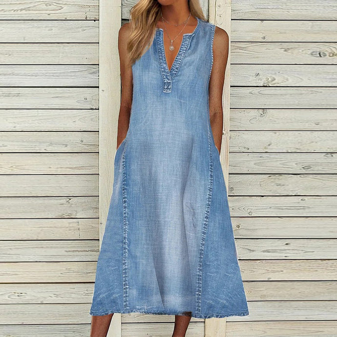 Notched Sleeveless Pockets Midi Denim Dress
