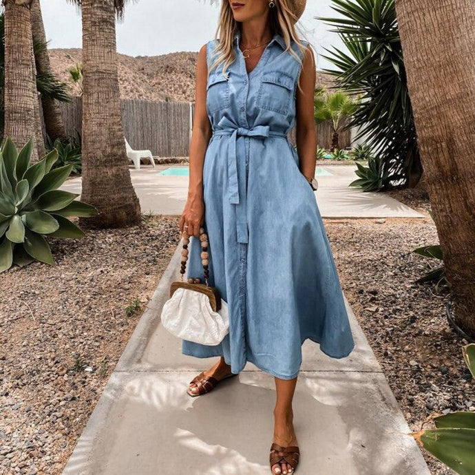 Sleeveless Buttons Down Midi Denim Dress