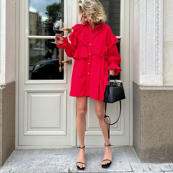 Red Flounce Asymmetrical Turndown Collar Shirt Dress