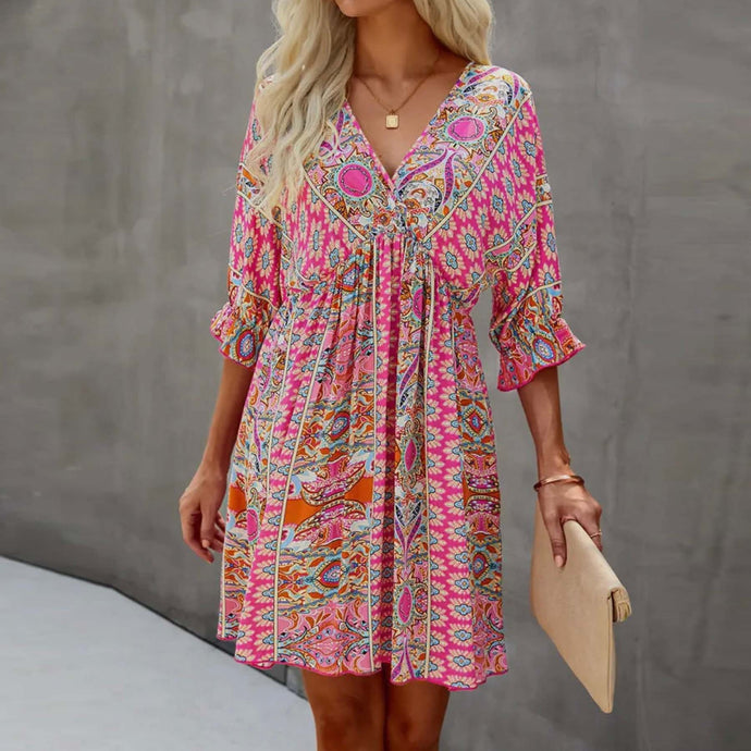 High-Low Printed V-Neck Cap Sleeve Midi Dress