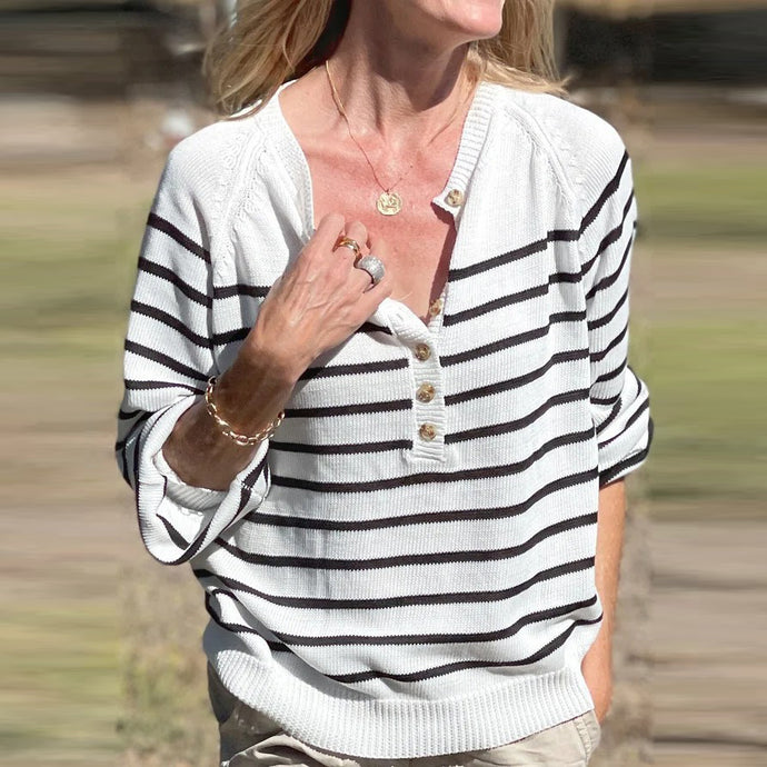 White and Black Stripped Buttons Long Sleeve Sweater