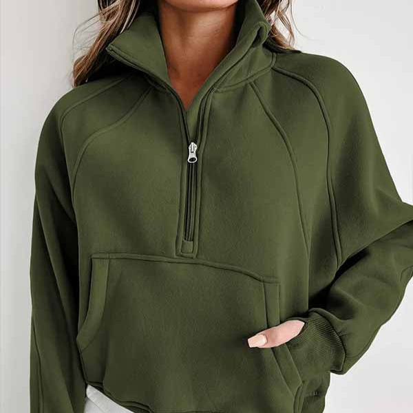 Green Zip Up Stand Collar Ribbed Thumbhole Sleeve Sweatshirt