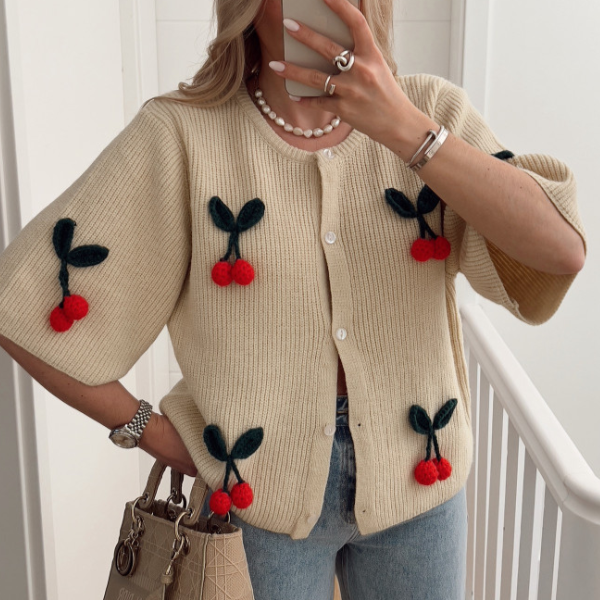 V-neck Cherry Embellished Cardigan Cropped Knitted Sweater