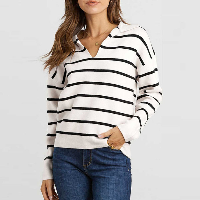 Striped Long Sleeve Polo V Neck Pullover Sweater