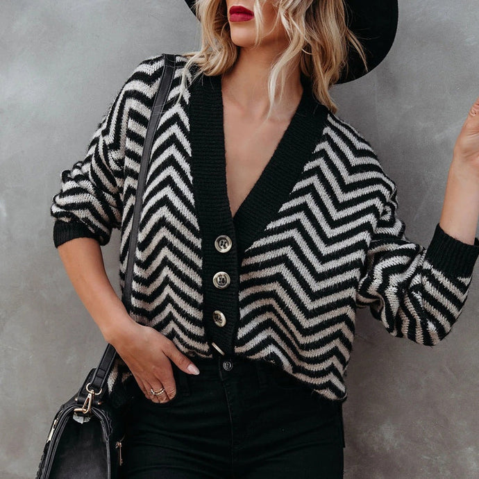 Loose Stripe V Neck Buttoned High Low Cardigan