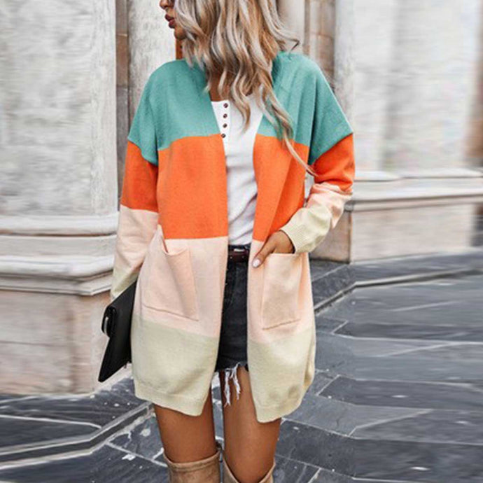 Contrasting rainbow paneled striped long cardigan sweater with pockets