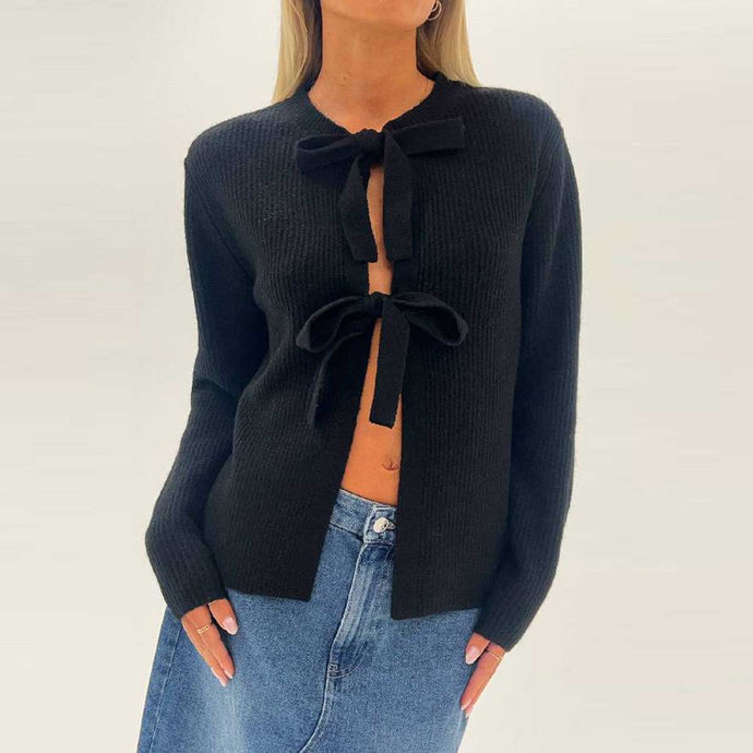Bow Pattern Front Tie-up Long Sleeve Loose Cardigan