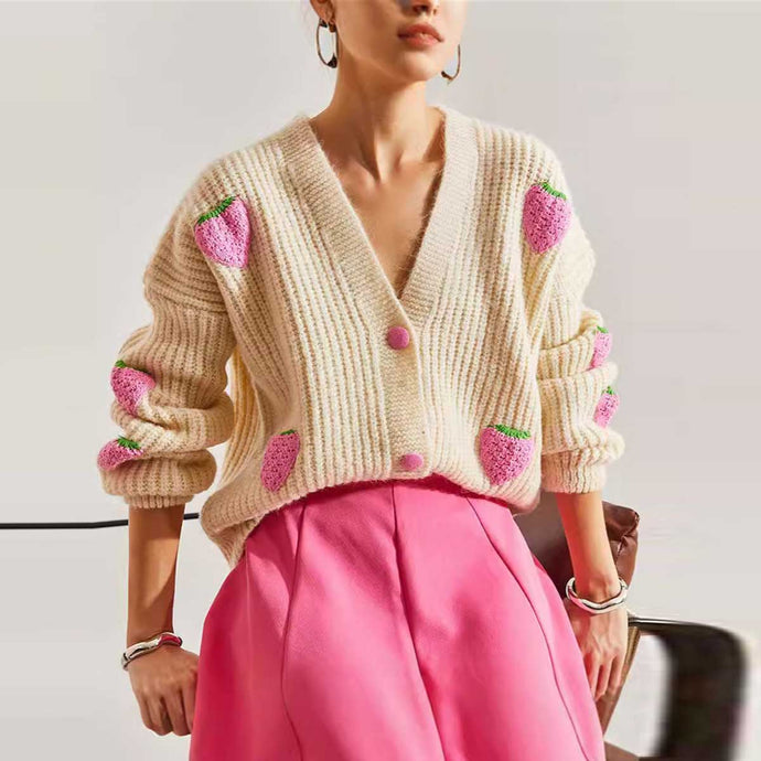 Sweet Beige Strawberry V-neck Cardigan Sweater