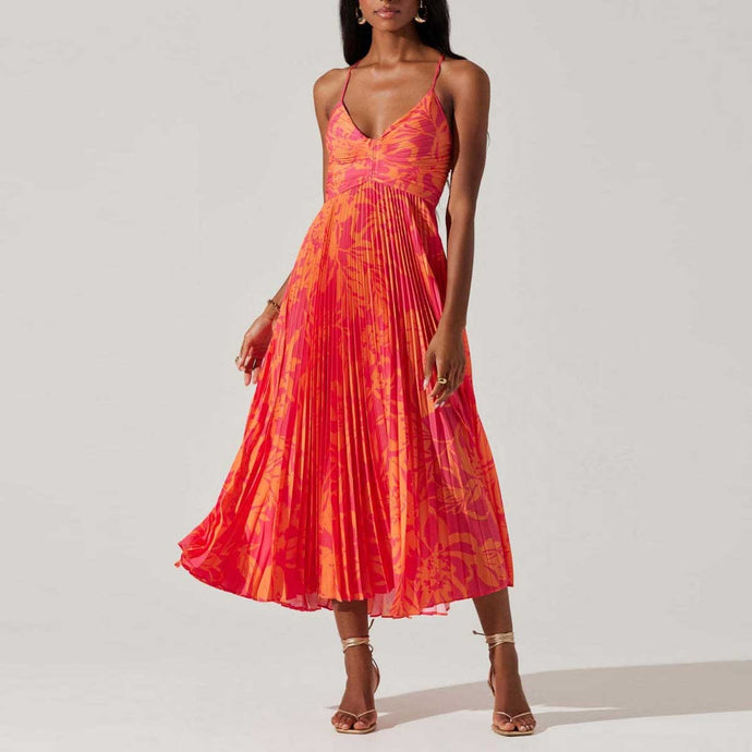 Chic Spaghetti Straps Printed Pleats Midi Dress