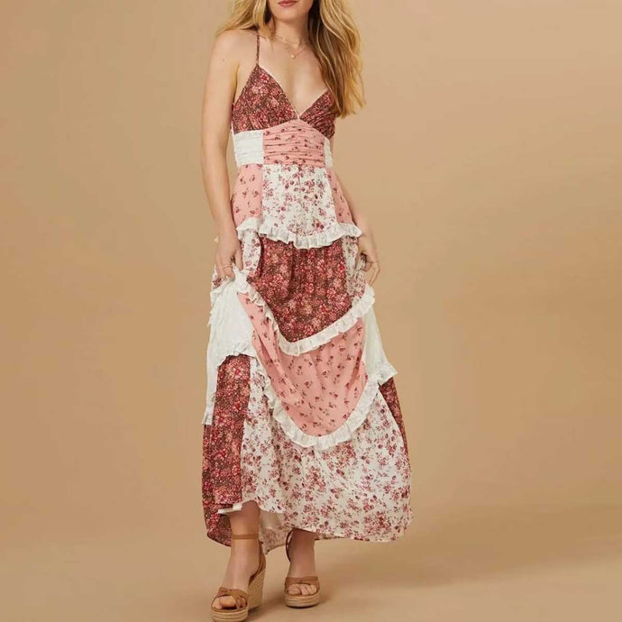 Sweet Spaghetti Straps Floral Patchwork Maxi Dress