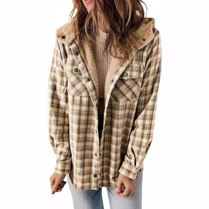 Long Sleeves Flannel Plaid Fleece Hooded Shacket
