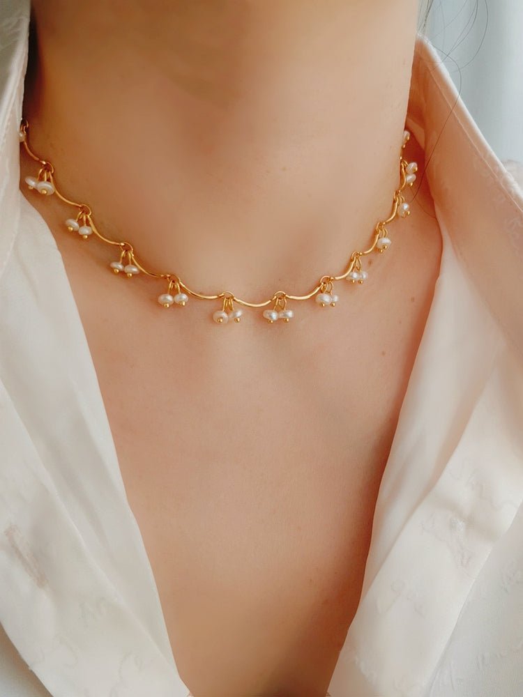 Crafted with elegance, the Gold Romantic Floral-Inspired Pearl Necklace features delicate pearl accents arranged in a floral motif, adding a touch of refined femininity to any ensemble. Its gold-tone finish enhances the necklace's timeless appeal, making it an ideal accessory for both formal occasions and everyday sophistication. This piece seamlessly blends classic charm with subtle romance, perfect for those seeking to elevate their jewelry collection with expert craftsmanship and graceful design.