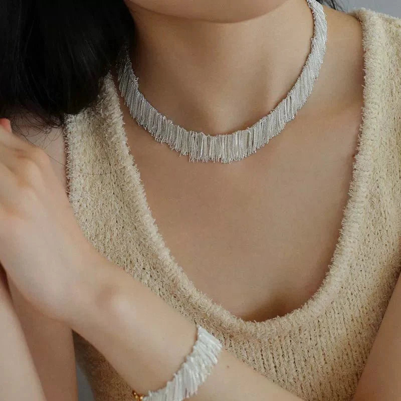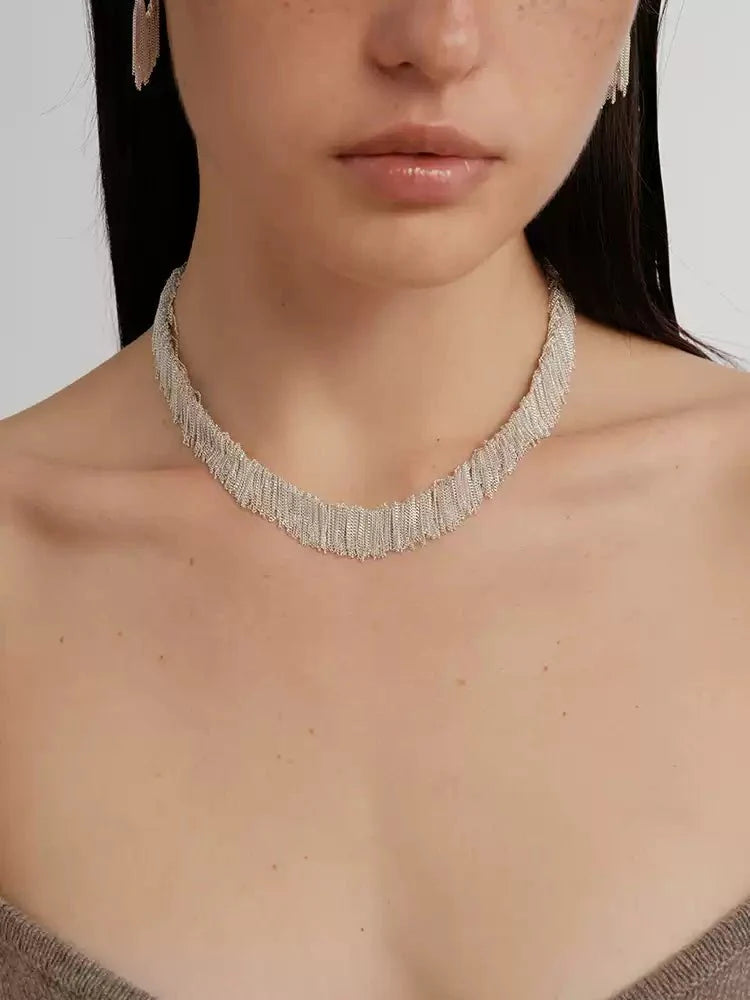 Elevate your elegance with a captivating tassel necklace that embodies the magic of a galaxy's waterfall. Handcrafted with meticulous attention, each delicate tassel gracefully dances with shimmer and shine. Experience a mesmerizing flow of light and shadow, a symphony of romance that will leave you enchanted. Embrace the graceful dance of dreams with this radiant piece, a canvas of radiant dreams that glows with every movement.