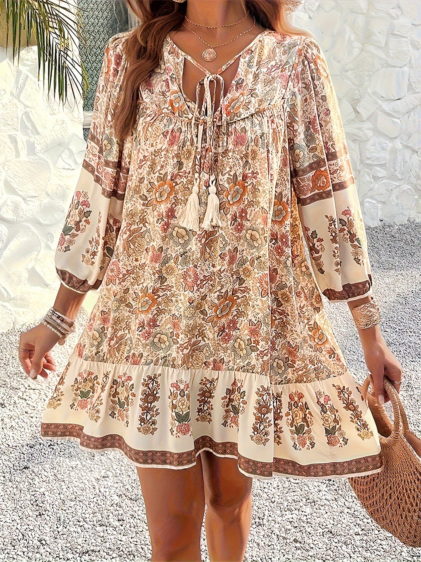 Embrace effortless elegance with this Loose Boho Long Sleeve Floral Tie Neck Mini Dress. Crafted for comfort and style, its flowing silhouette and delicate floral pattern create a timeless bohemian look. The long sleeves offer subtle coverage, while the tie neck detail adds a refined touch. Perfect for casual outings or special occasions, this dress combines breathable fabric with a flattering mini length to keep you comfortable and chic throughout the day.