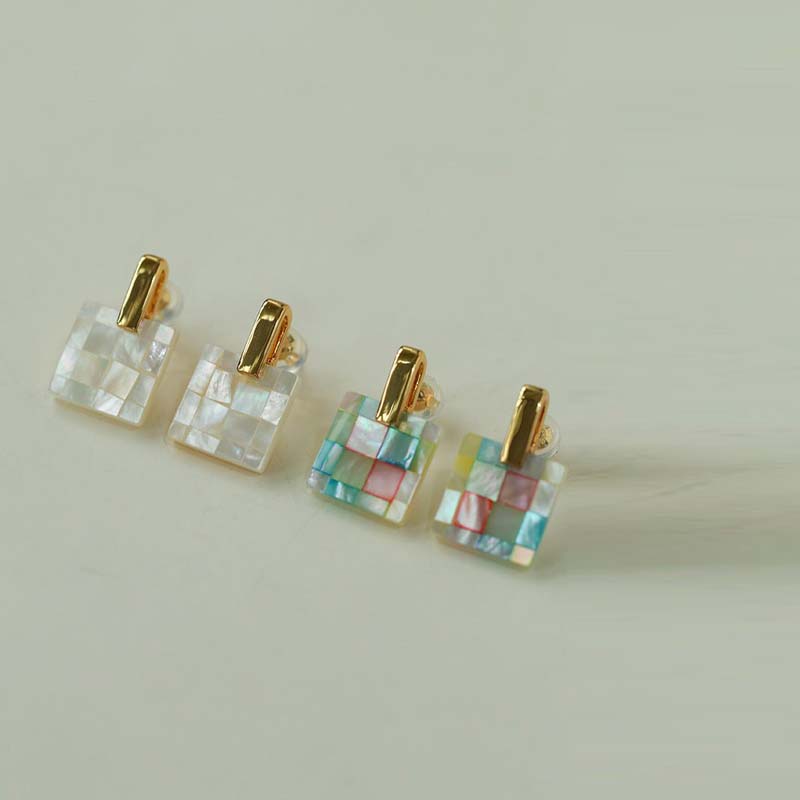 Add a playful yet sophisticated touch to your look with our Geometric Pearl Mosaic Stud Earrings — a modern twist on classic elegance. Crafted with hand-assembled mother-of-pearl tiles arranged in a delicate checkerboard pattern, these square stud earrings feature a subtle iridescent sheen that catches the light beautifully.