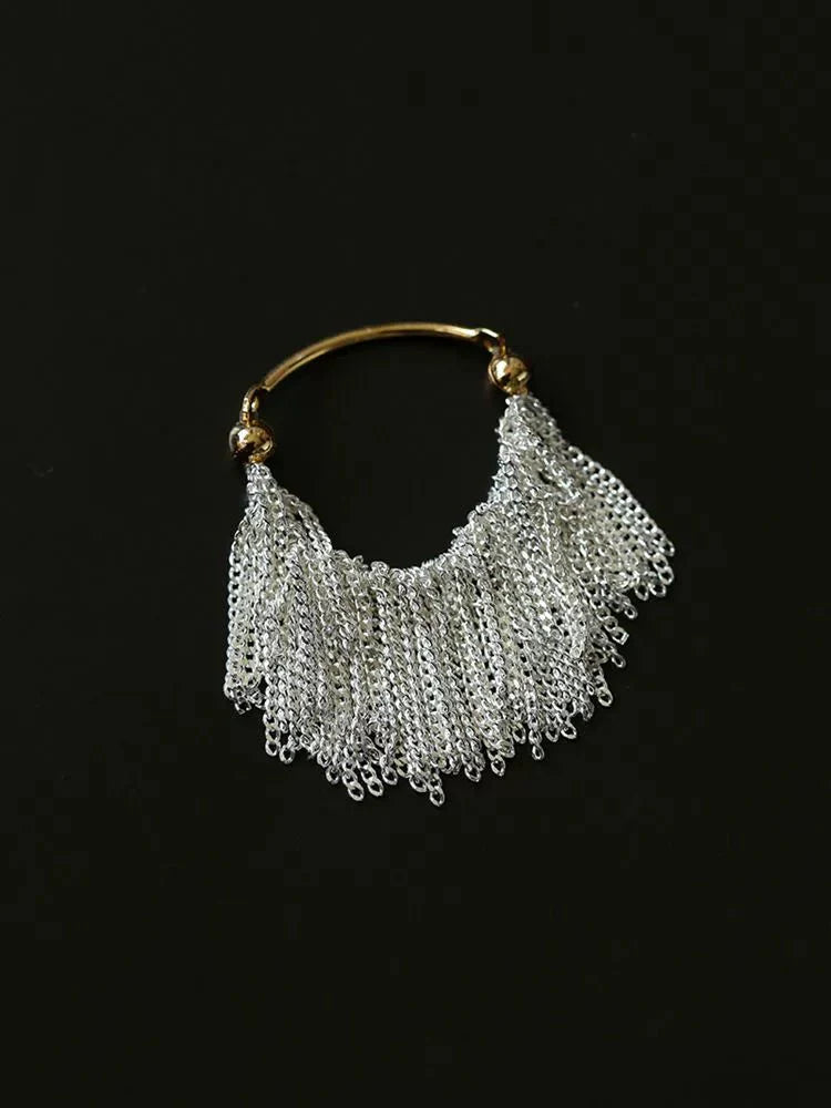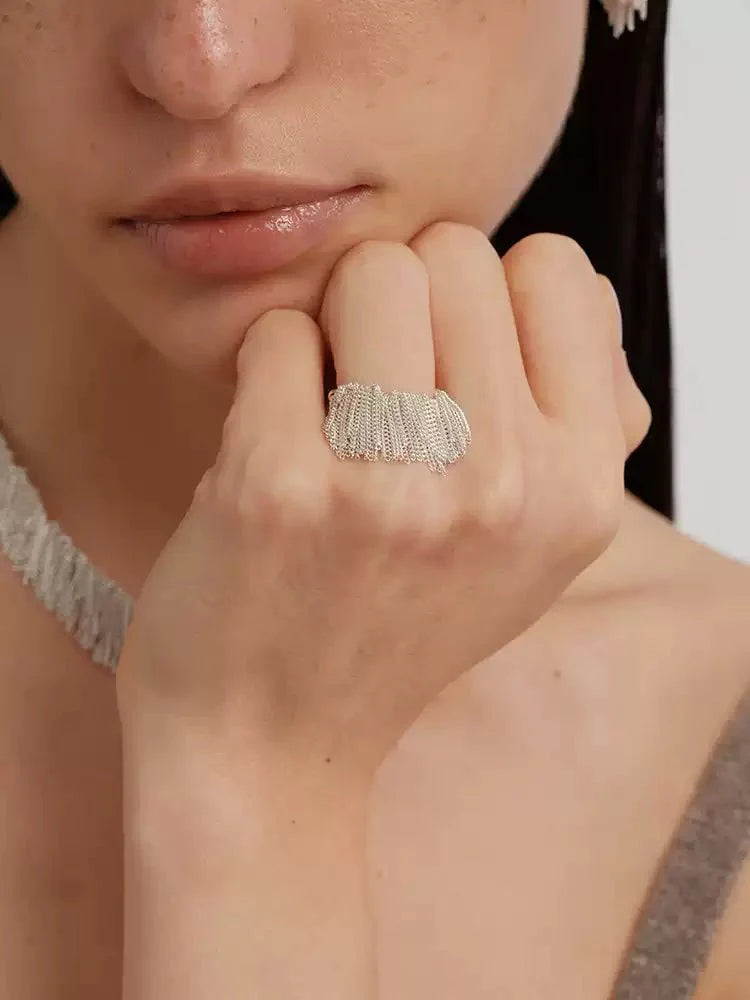 Make a bold, artistic statement with our Silver Fringe Ring, a captivating piece that blends modern minimalism with delicate movement. Crafted from fine silver-toned metal chains, this ring features a cascading fringe design that drapes gracefully over the finger, creating a shimmering effect with every gesture.